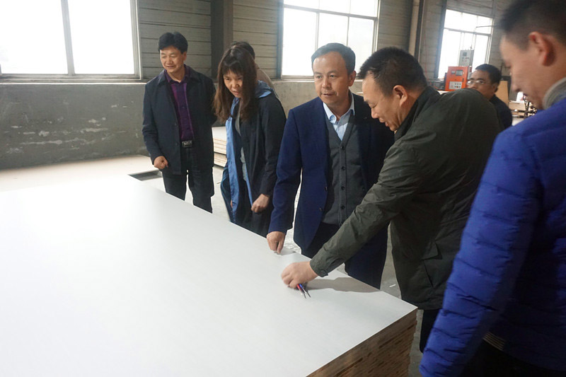 (周董事長(zhǎng)在為省林業(yè)局產(chǎn)業(yè)辦副主任鄒艷靈、中方縣林業(yè)局局長(zhǎng)王笑春講解寰宇板材)