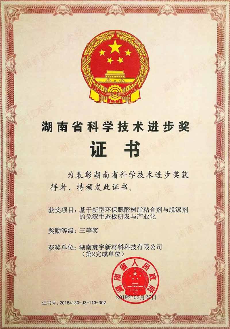 2018年度湖南省科學(xué)技術(shù)獎(jiǎng)評(píng)審結(jié)果公布,我公司(湖南寰宇新材料科技股份有限公司)和懷化學(xué)院強(qiáng)強(qiáng)聯(lián)手,通過(guò)校企合作研發(fā)“新型環(huán)保脲醛樹脂粘合劑”和“脫漆劑”面漆生態(tài)板產(chǎn)業(yè)化項(xiàng)目,改進(jìn)了免漆板生產(chǎn)工藝,降低了生產(chǎn)成本,甲醛釋放量達(dá)到了國(guó)際先進(jìn)的E0級(jí)標(biāo)準(zhǔn)。解決了板材生產(chǎn)用脲醛樹脂膠毒性大、粘合力低、儲(chǔ)存期短、穩(wěn)定性差等問(wèn)題。“脲醛樹脂膠”和“脫漆劑”還解決了面漆生態(tài)板產(chǎn)業(yè)化關(guān)鍵問(wèn)題。我公司該項(xiàng)目執(zhí)行三年來(lái)累積新增產(chǎn)值2億多元。