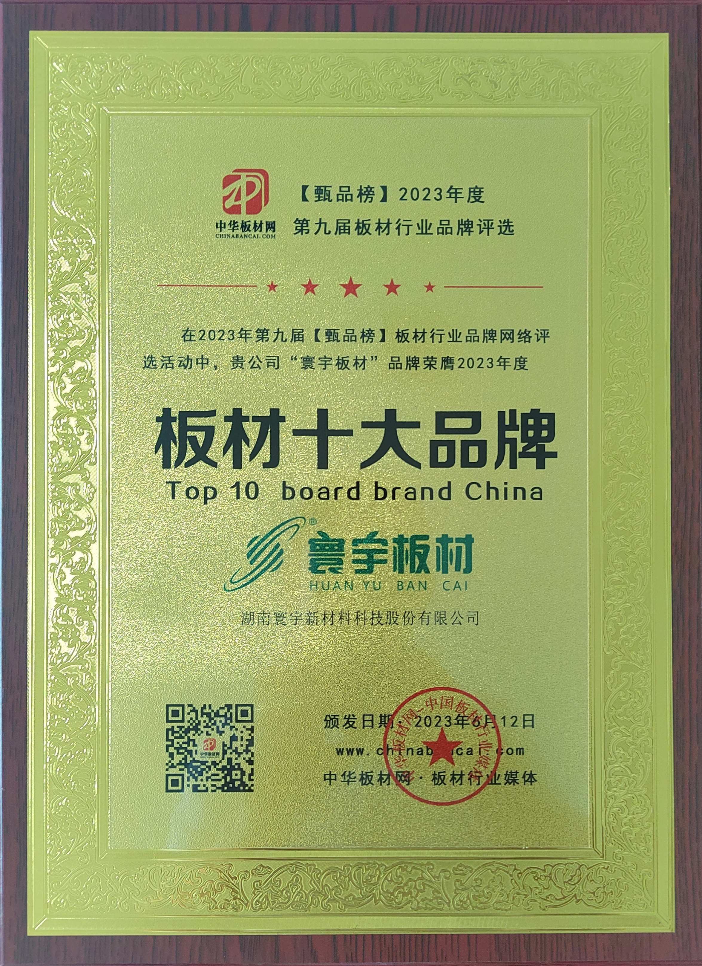 由中華板材網(wǎng)發(fā)起的“甄品榜·2023年度中國板材行業(yè)十大品牌評選活動(dòng)”經(jīng)過30多天的角逐競爭,巔峰之戰(zhàn)落下帷幕。寰宇板材憑借著品牌絕佳的口碑、綠色環(huán)保的品質(zhì)等較高的綜合評分,榮獲2023年度甄品榜·板材十大品牌